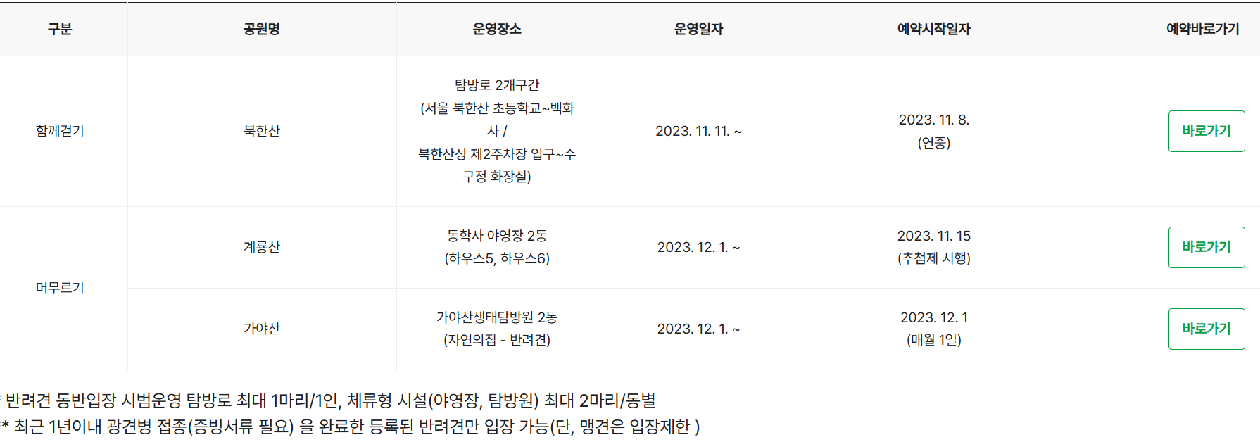 아, 그리고 국립공원 내 반려견 동반입장 시범사업 대상지에서 반려견과 함께 국립공원을 걷거나, 야영장이나 생태탐방원에서 최대 3박을 함께 보낼 수 있습니다.
