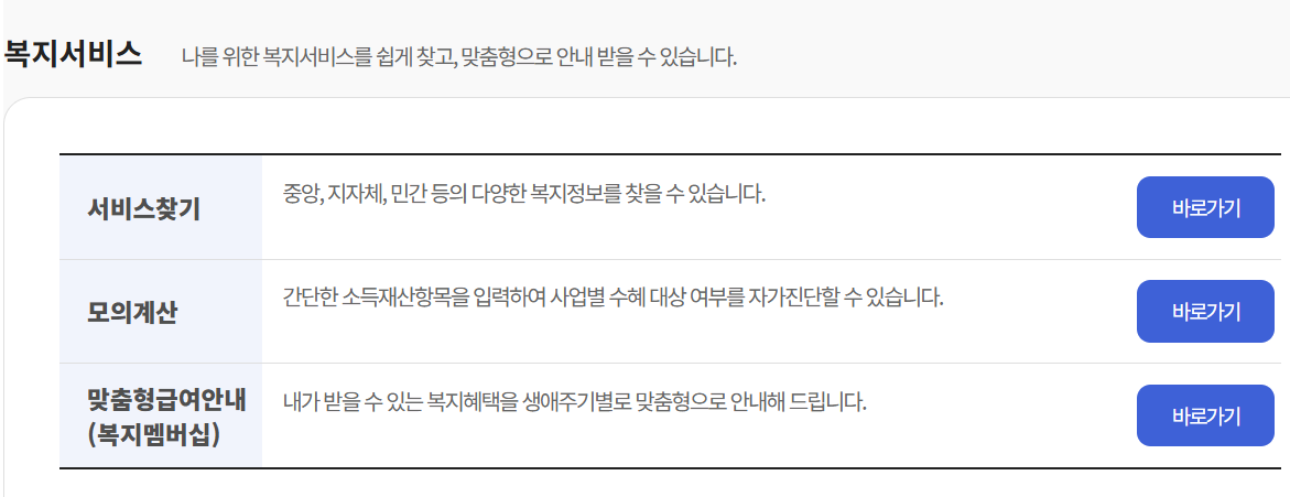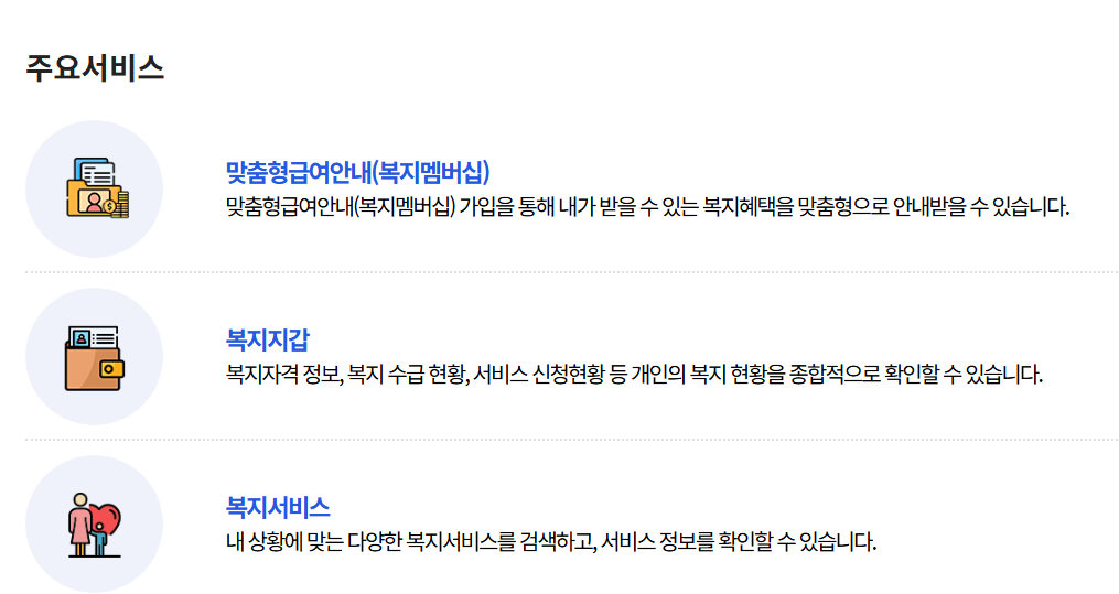 💡 복지로는 정부24와 연계된 복지 전문 포털이라 특히 보건복지부 주관 혜택은 대부분 여기서 확인 가능해요.